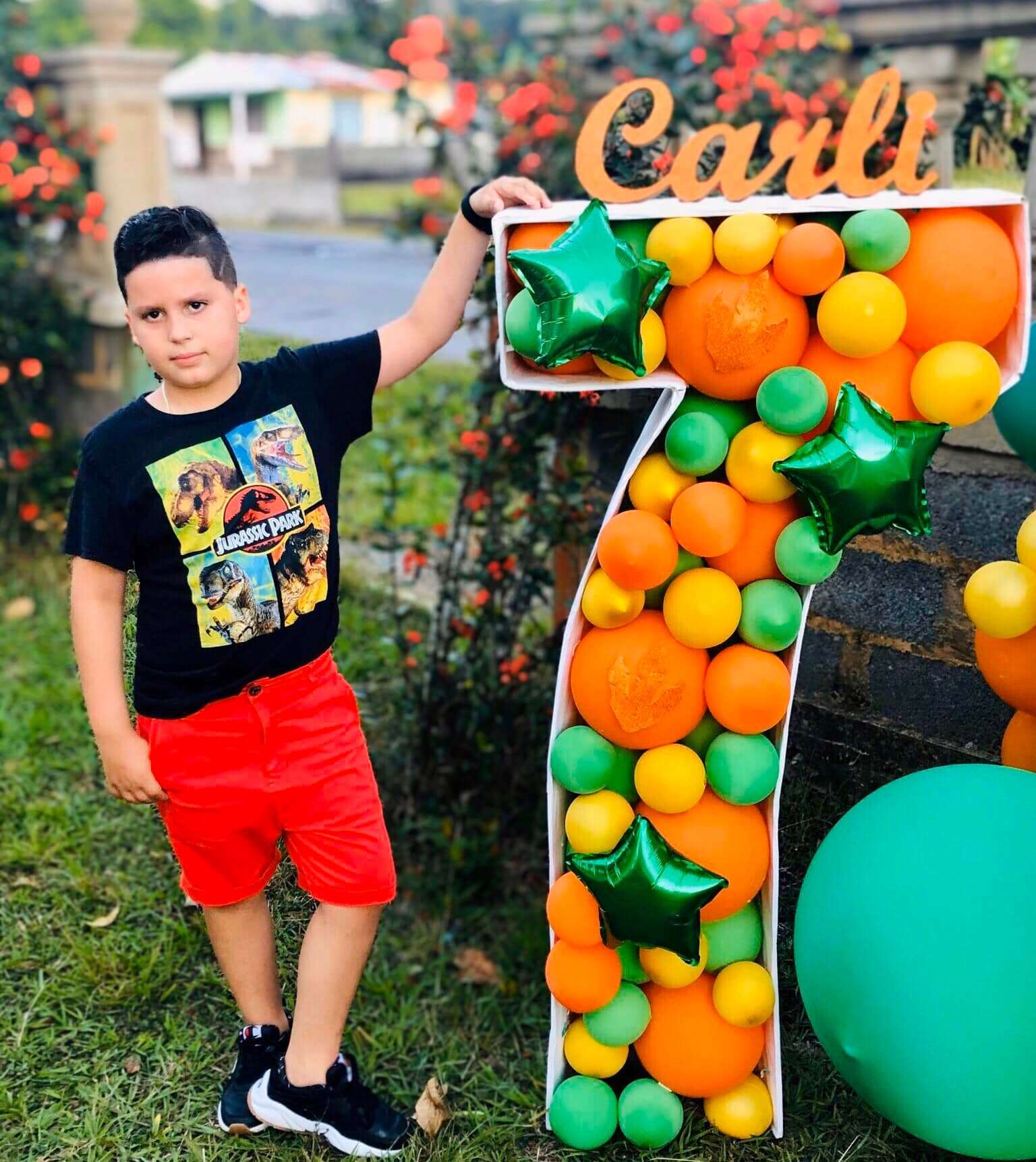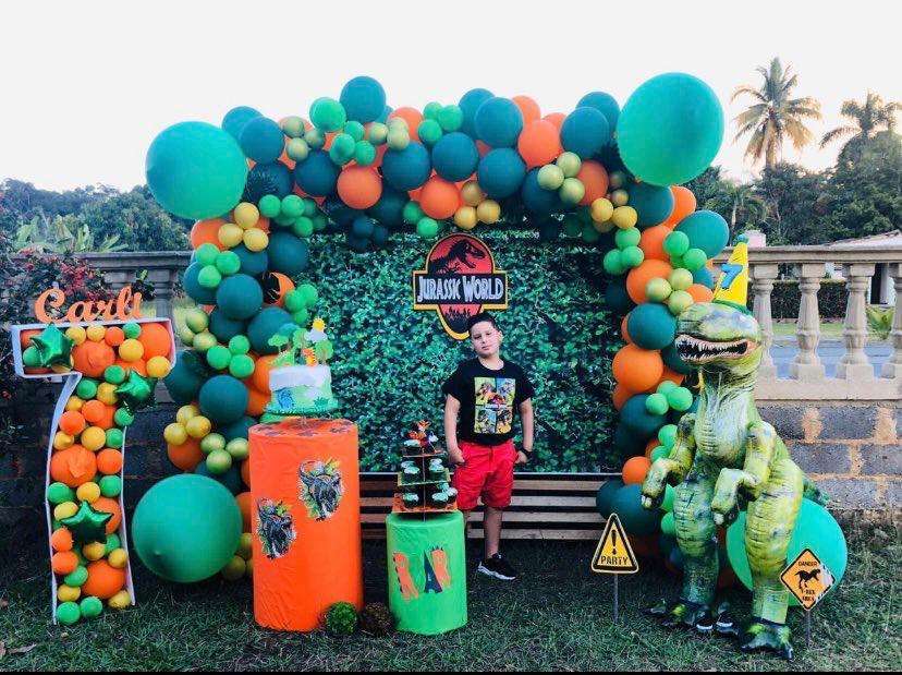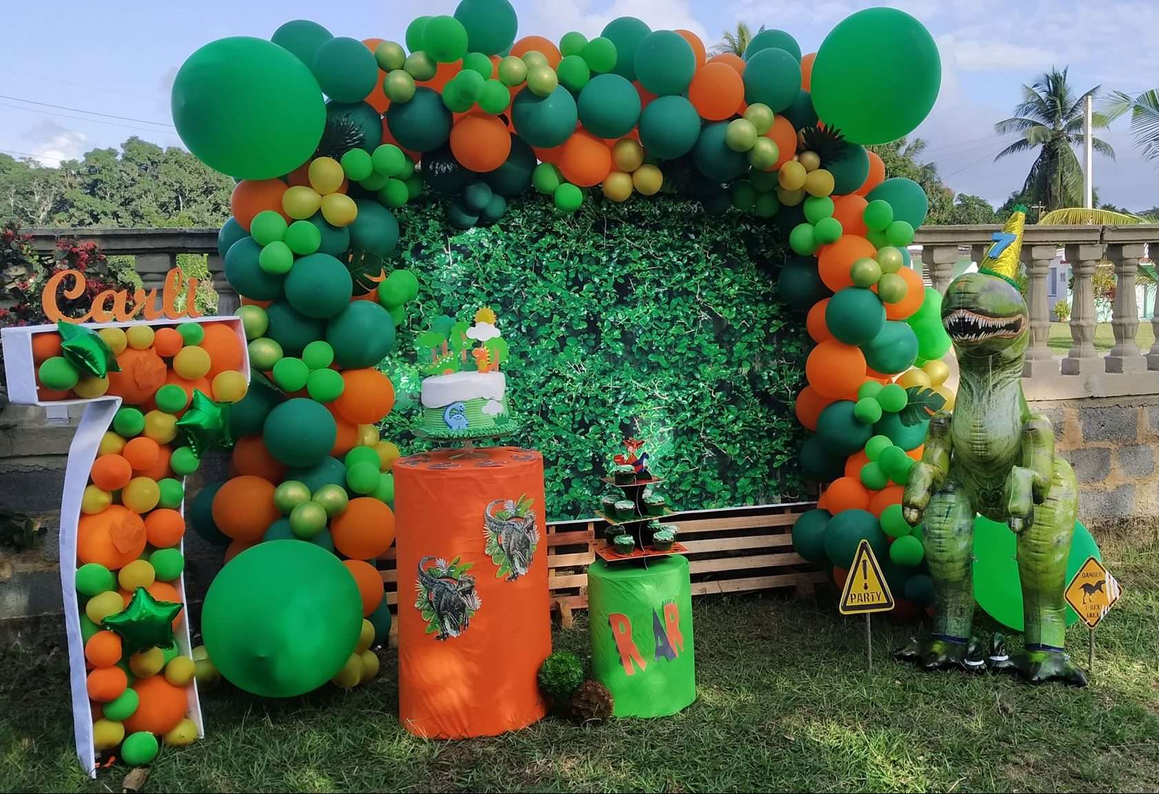 Para el cumpleaños temático de dinosaurios de Carlitos, creamos una decoración inmersiva y vibrante que trajo la era jurásica a la vida. El centro de la decoración fue el escenario, donde colocamos el pastel y los regalos. Esta área estaba enmarcada por un impresionante arco de globos con varios tonos de verde y globos naranja brillante, evocando una exuberante jungla prehistórica. Para complementar el arco, colocamos cilindros temáticos en el escenario para sostener los regalos y el pastel, añadiendo altura y un interés visual único a la decoración. La combinación de los tonos verdes y los toques de naranja creó una atmósfera dinámica y emocionante, perfecta para un joven entusiasta de los dinosaurios como Carlitos.